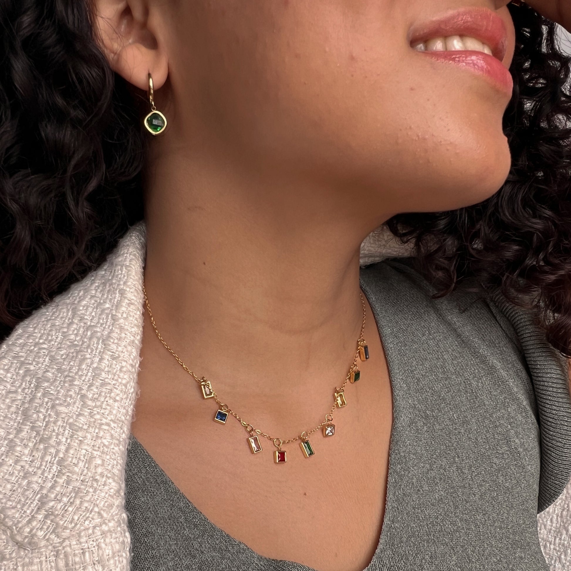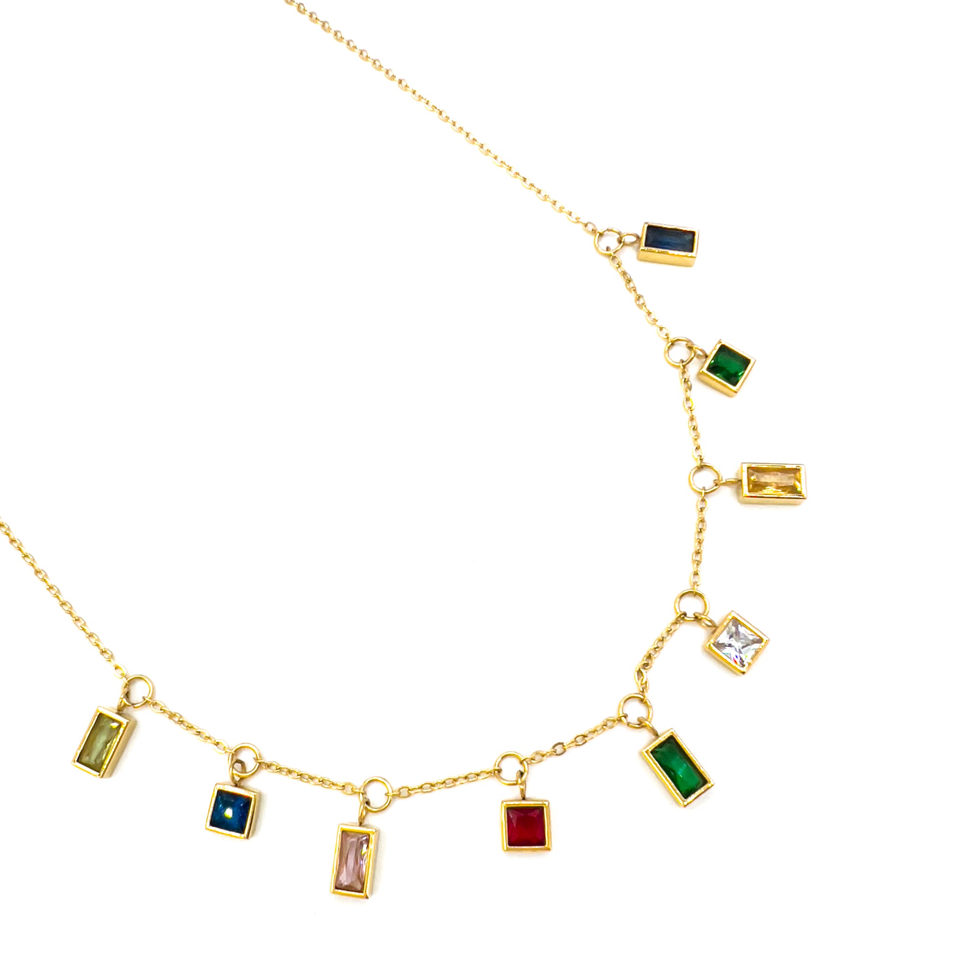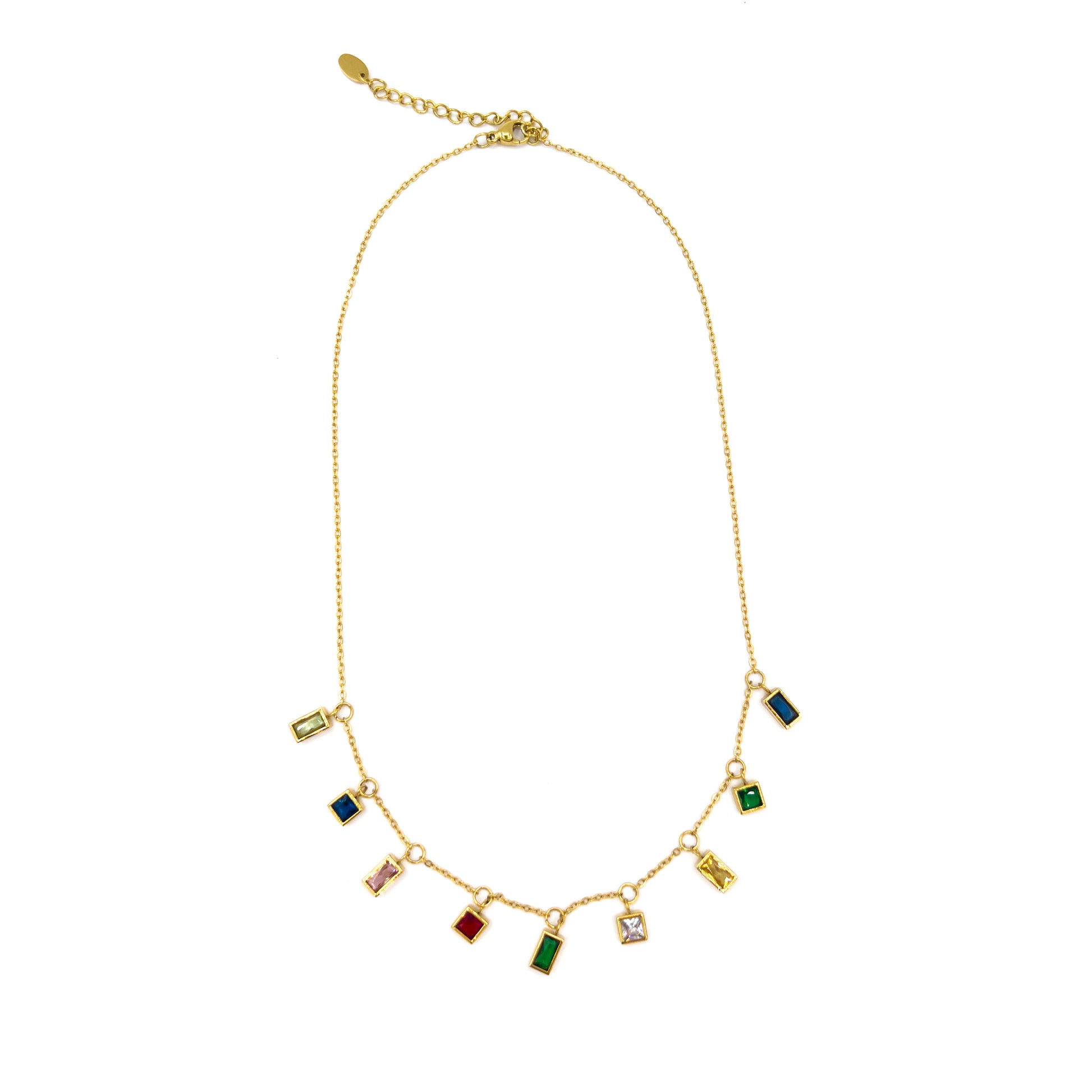 Colgante de acero inoxidable bañado en oro de 18k con charms de circonitas multicolor.