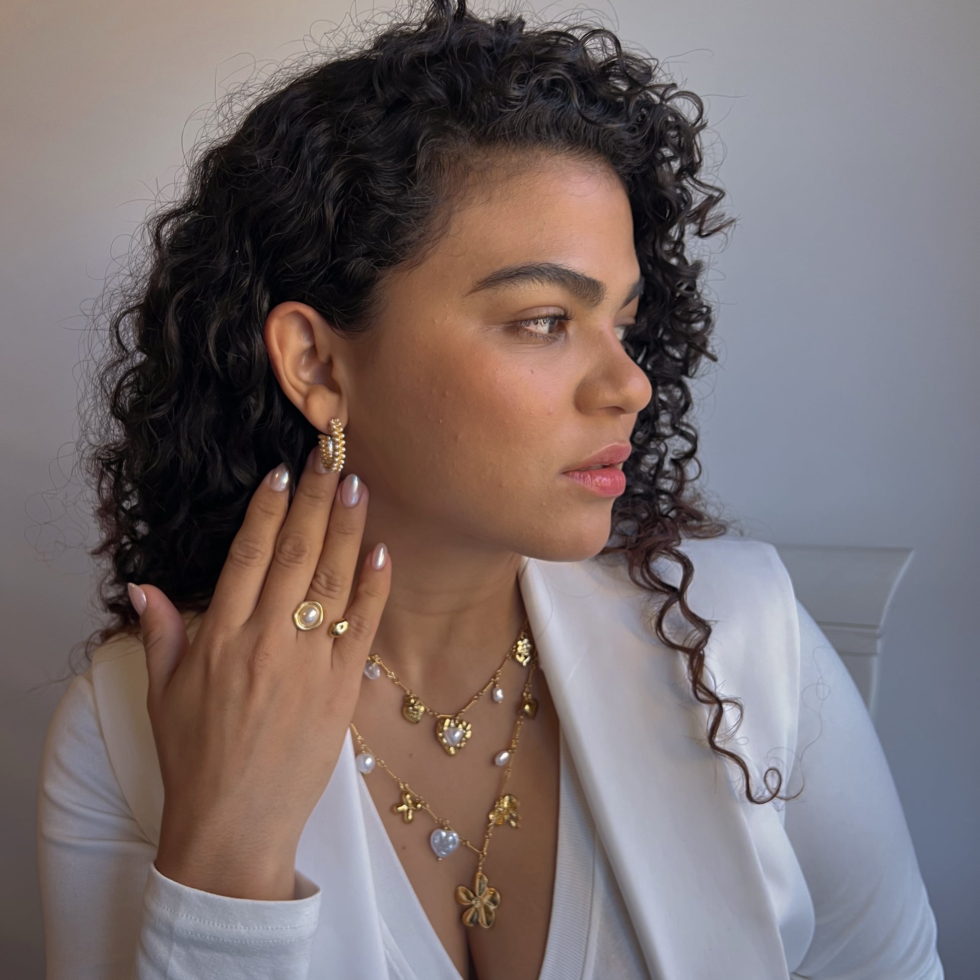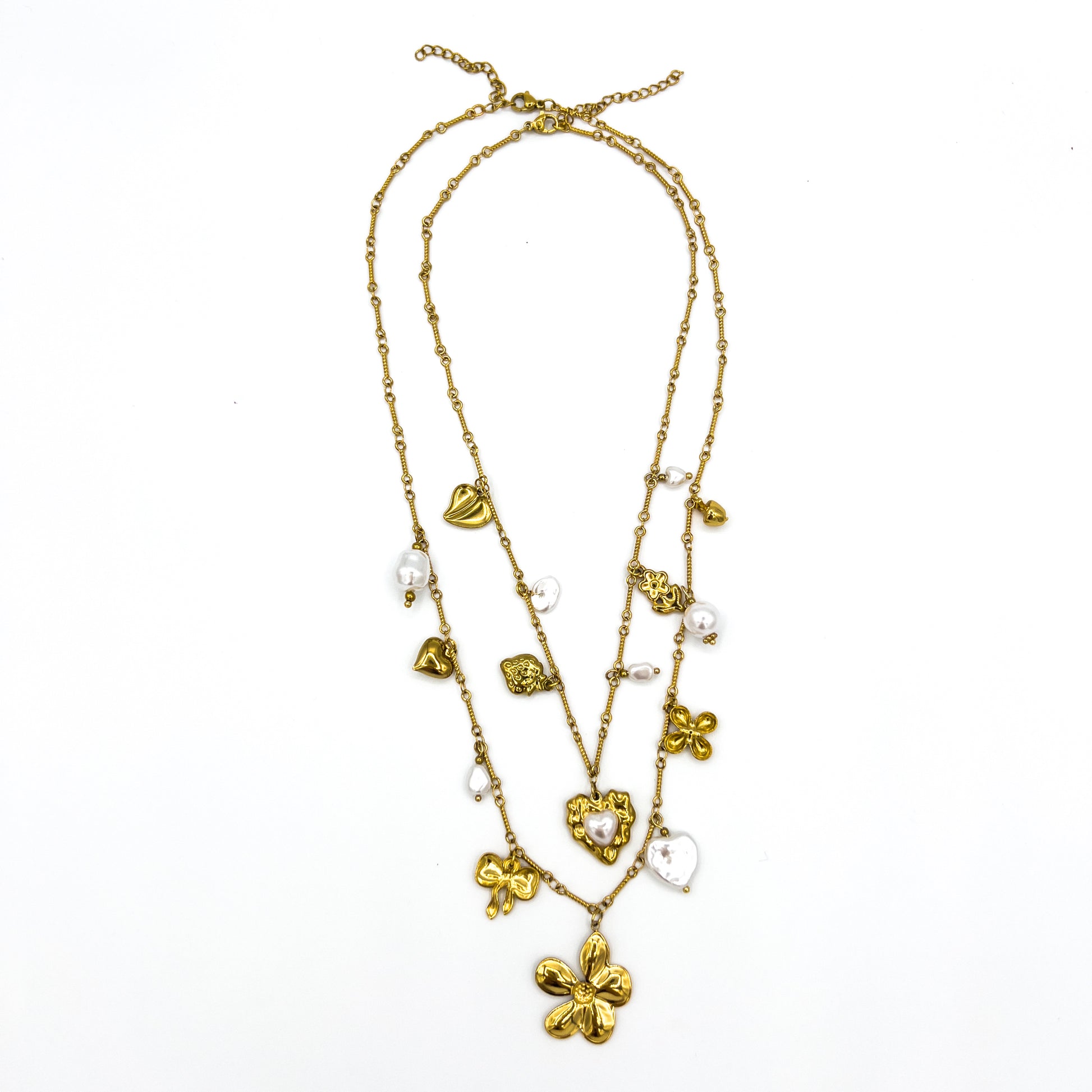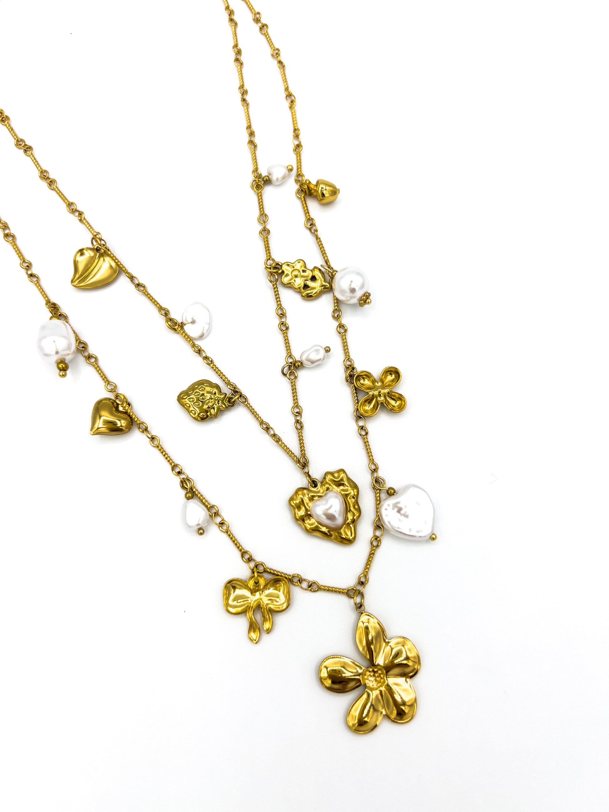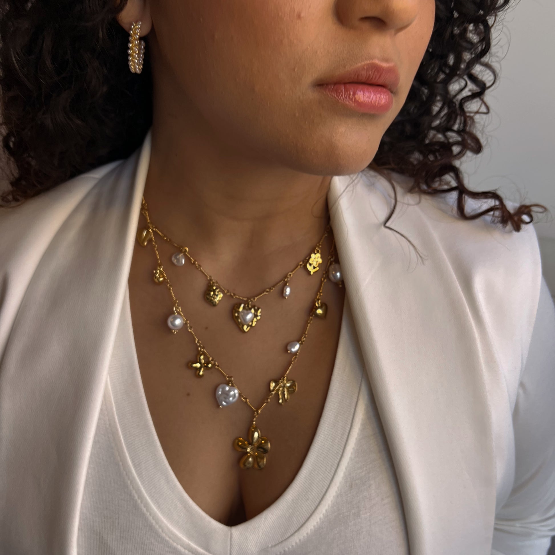 Dúo de colgantes de acero inoxidable bañado en oro de 18k con charms acrílicos efecto nácar. Se pueden llevar juntos o separados.