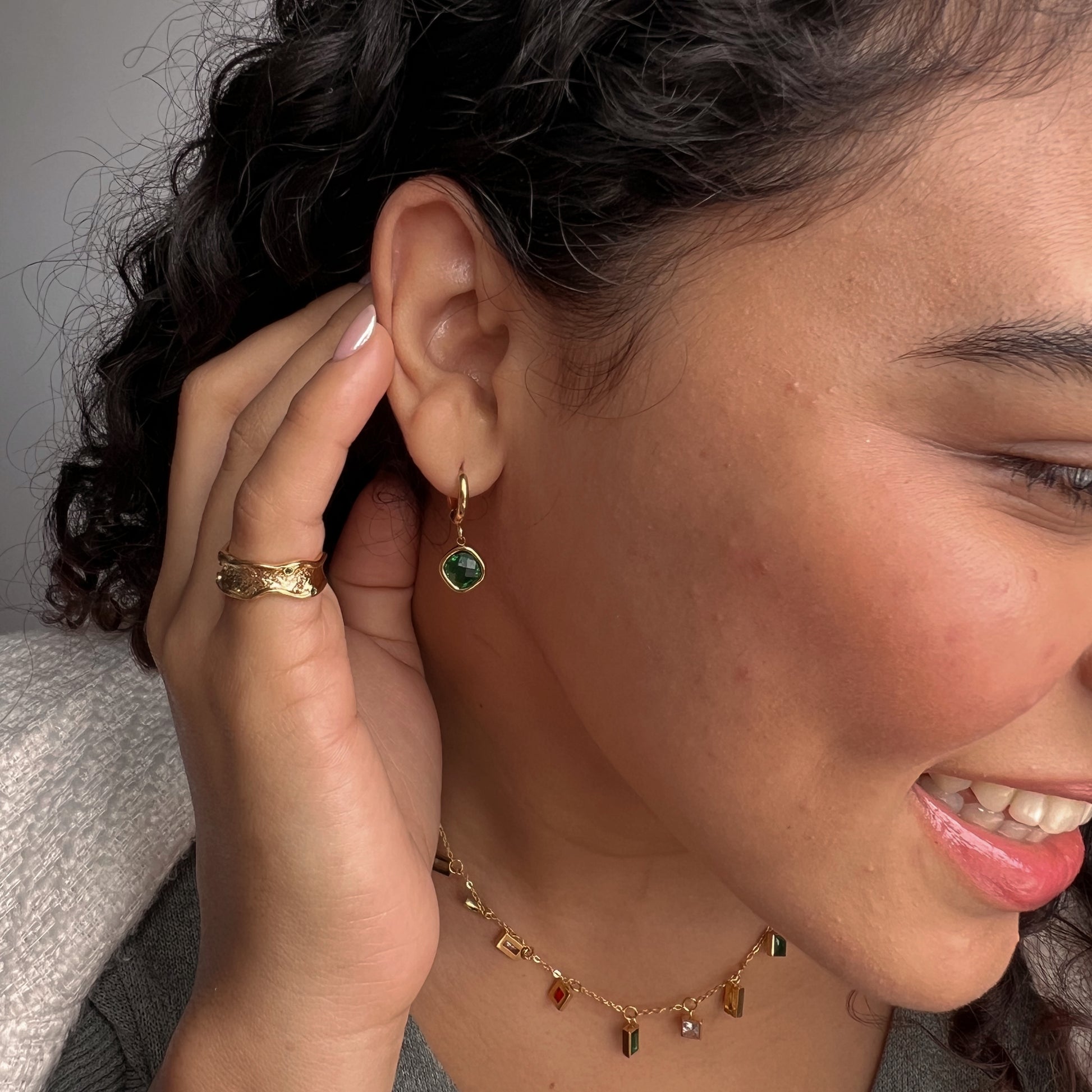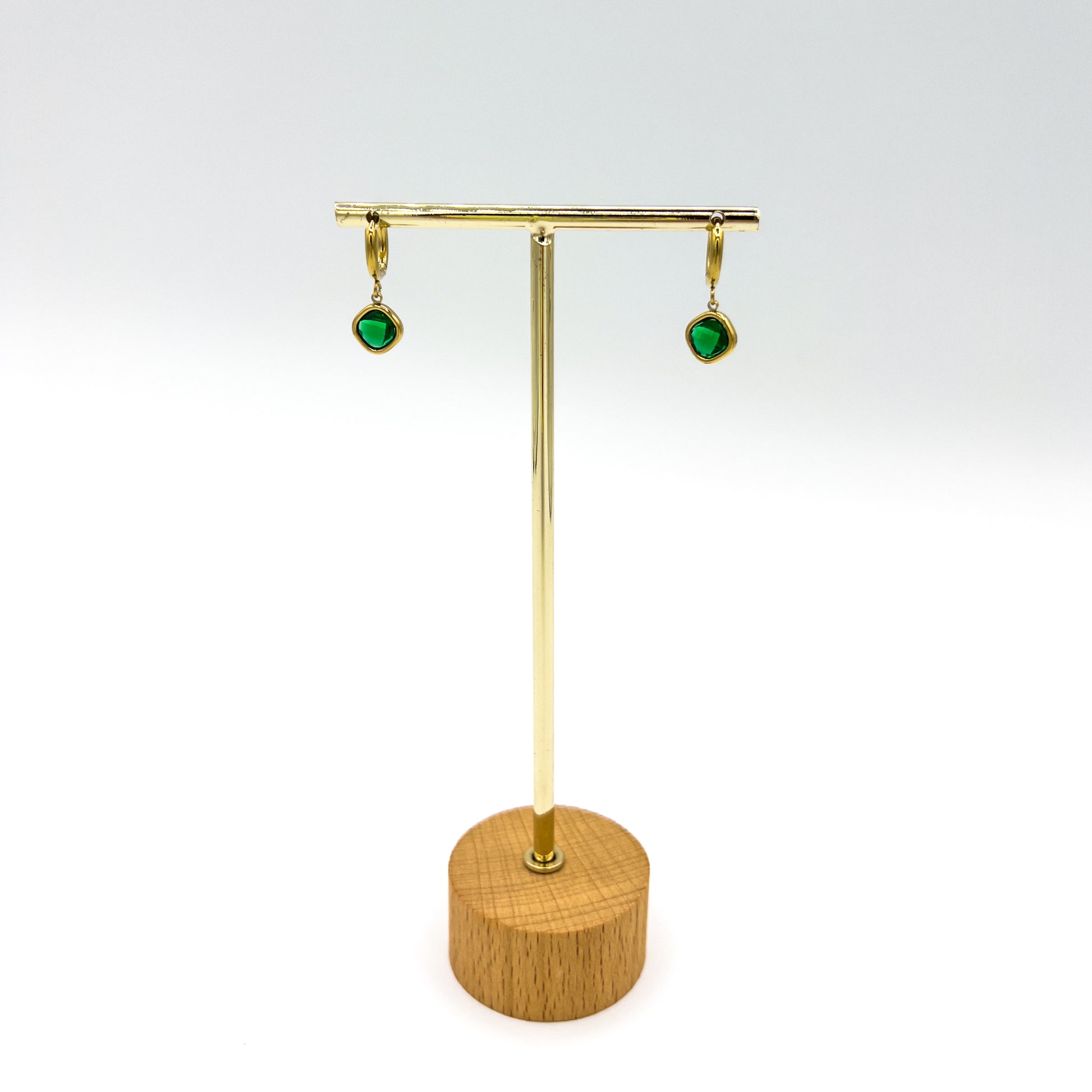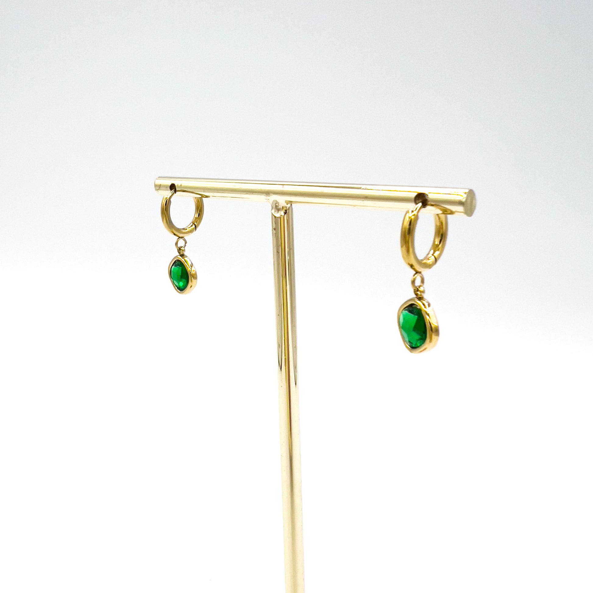 Pendientes de aro pequeño de acero inoxidable con charm de circonita verde.