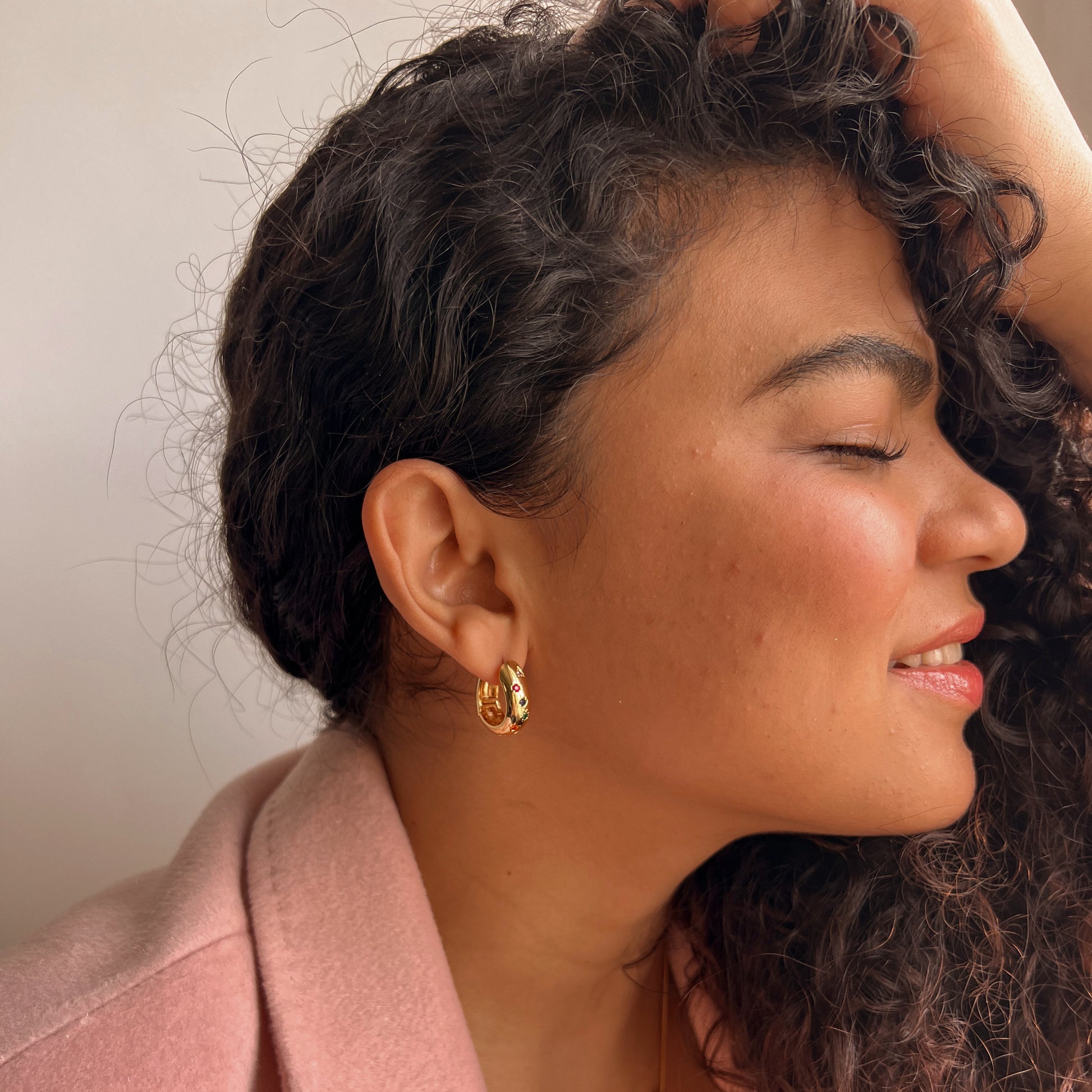 Pendientes de acero inoxidable bañado en oro 18k con circonitas multicolor.