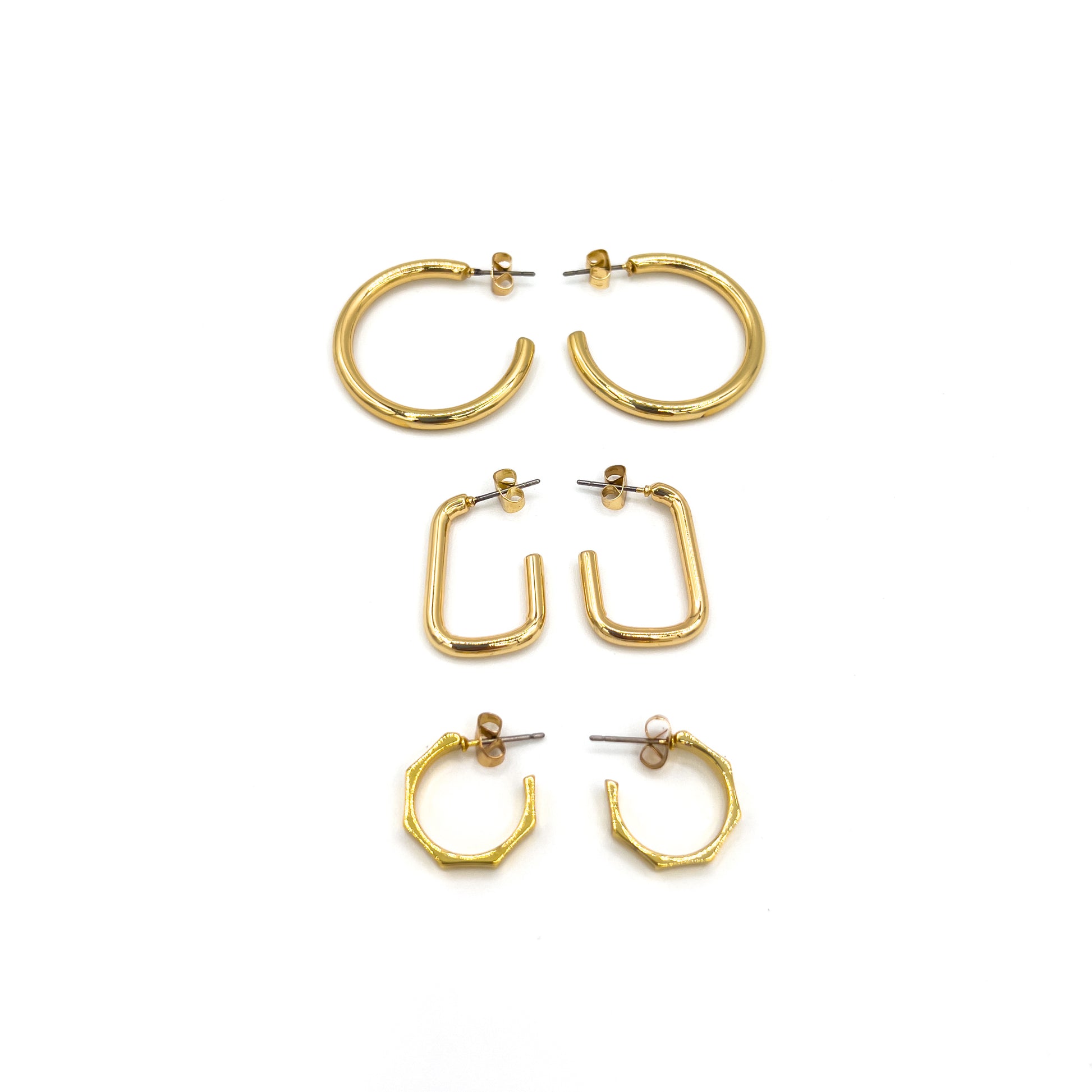 Set Prisma – 3 pares de pendientes de aro geométricos en acero inoxidable.